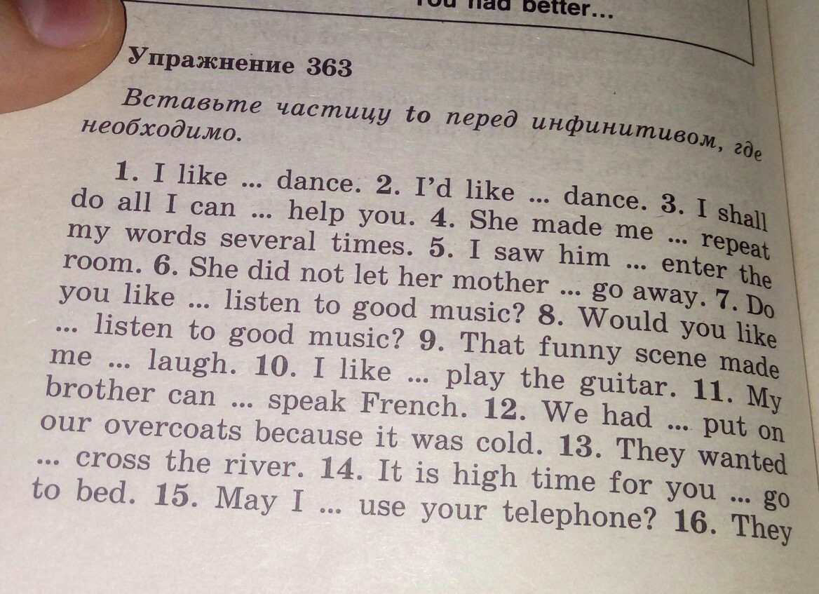 1. to dance 2. dance 3. can help 4. made me repeat 5. I saw him enter 6. to go away 7. to listen 8. would you like listen ... 9. made me laugh 10. I like to play ....11. can speak 12. had to put on 13. to cross 14. to go to bed 15. May I use .......