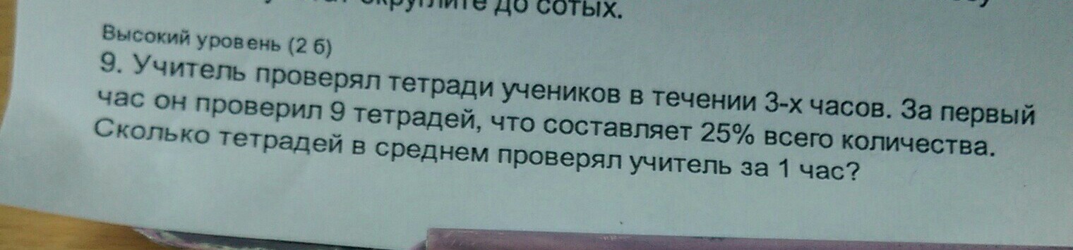 Если 9 тетрадей составляет 25%, то 100% = 9*4 =36 тетрадей. Если учитель проверял из три часа, то средняя скорость проверки за 1 час составит: