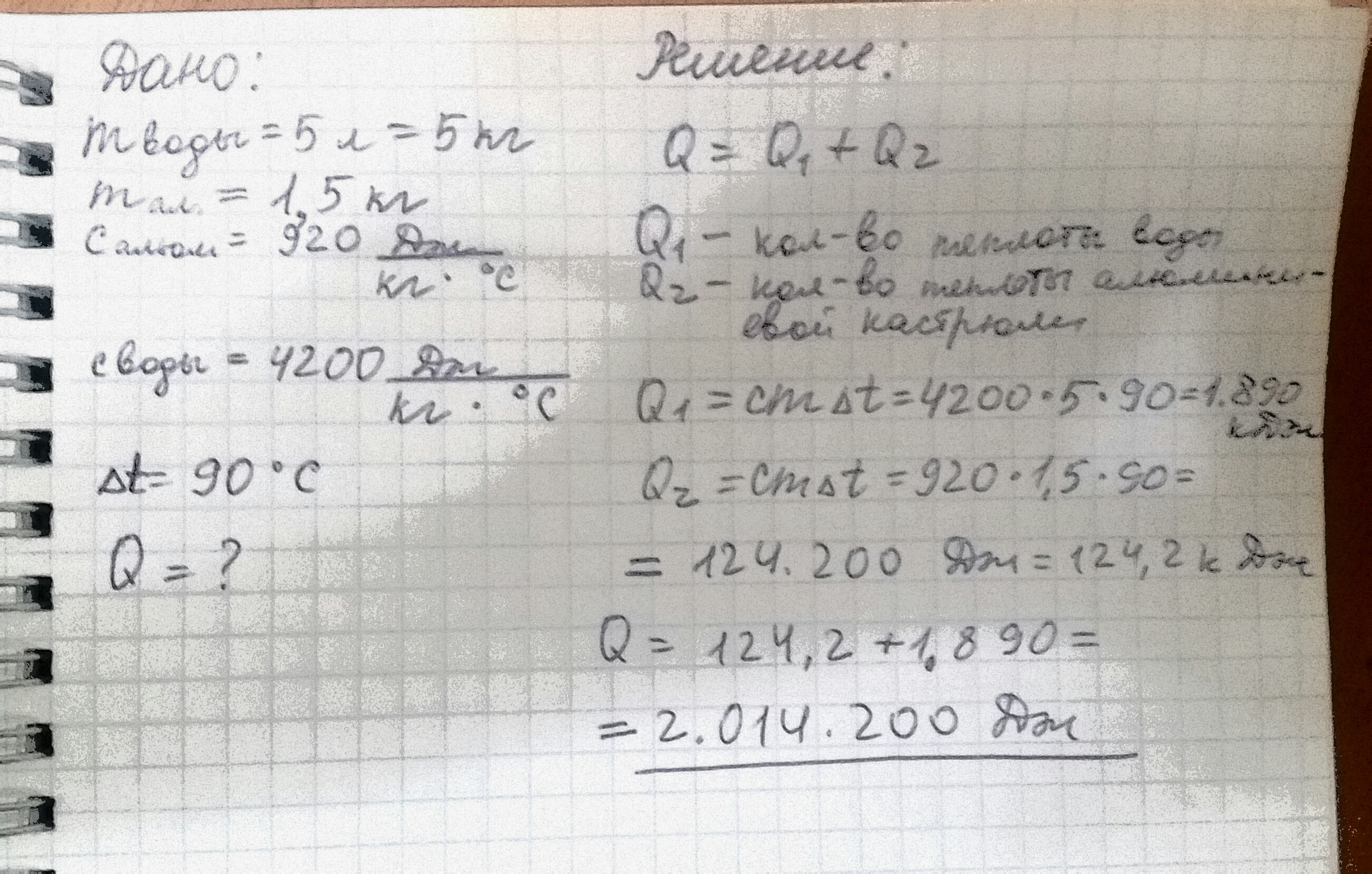 В аллюминевой кастрюле масса которой 1.5 кг нагрели 5 литров воды от 10 градусов до тимпературы кипения.Какое количество теплоты получила кострюля с водой?