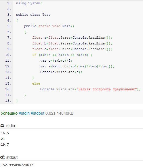 Даны три положительных числа a, b, c. Проверить, могут ли они быть длинами сторон треугольника. Если да, то вычислить площадь этого треугольника c#