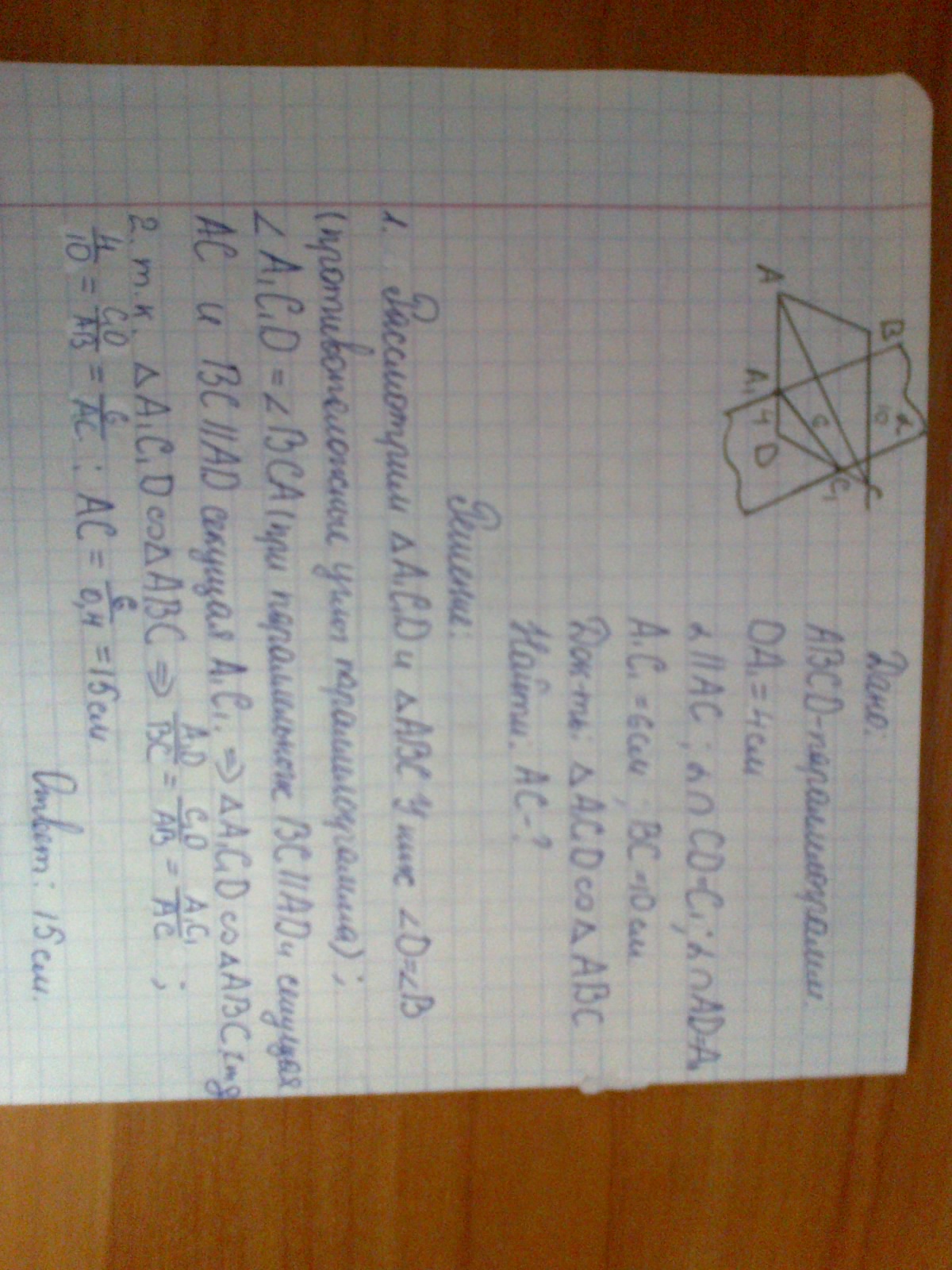 на стороне AD параллелограмма ABCD выбрана точка A1 так, что DA1=4 cм. Плоскость,параллельная диагонали AC,проходит через точку A1 и пересекает сторону CD в точке C1.Докажите,что треугольники A1C1D и ABC подобны.Найдите диагональ AC, если A1C1 = 6 см и BC = 10