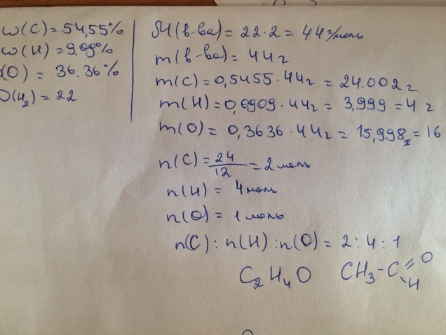 1. Выведите формулу кислосодержащего вещества, содержащего 54,55% углерода, 9,09% водорода и 36,36% кислорода. Относительная плотность паров этого вещества по водороду равна 22. (Ответ: С2Н4О)