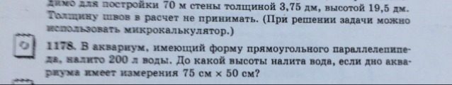 3) 200:(7,5*5)=40:7,5=40:75/10=40:15/2=40*2/15=80/15=5 5/15=5 1/3 дм - высота воды в аквариуме