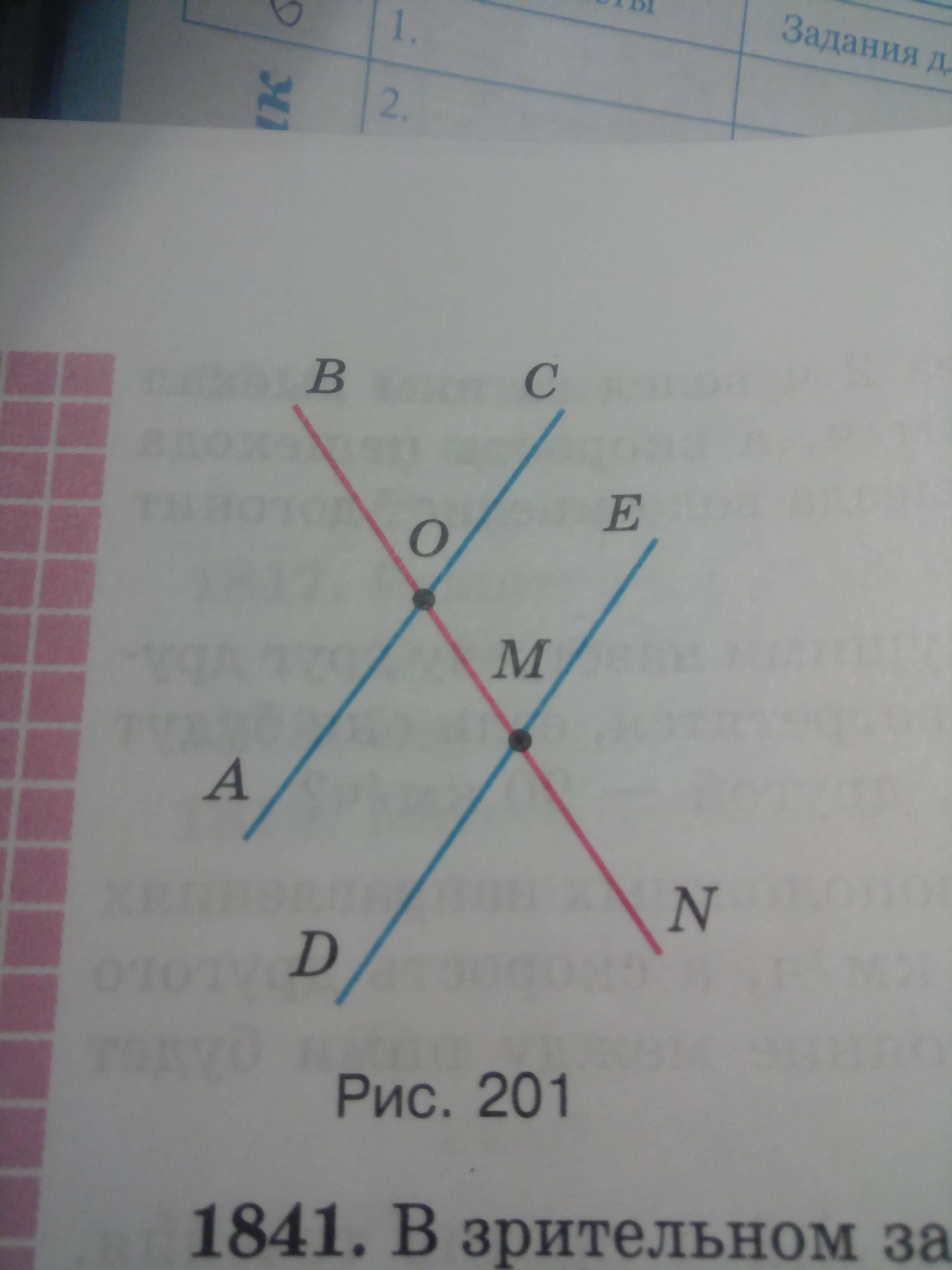 Измертье углы AOB, BOC, DMN, NME. Какие из этих углов равны?