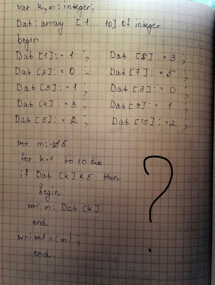 Там где стоит знак вопроса, данную часть нужно исправить, если есть ошибки. Задание было таким: Составьте программу для нахождения номера ученика, сделавшего наименьшее кол-во заданий.