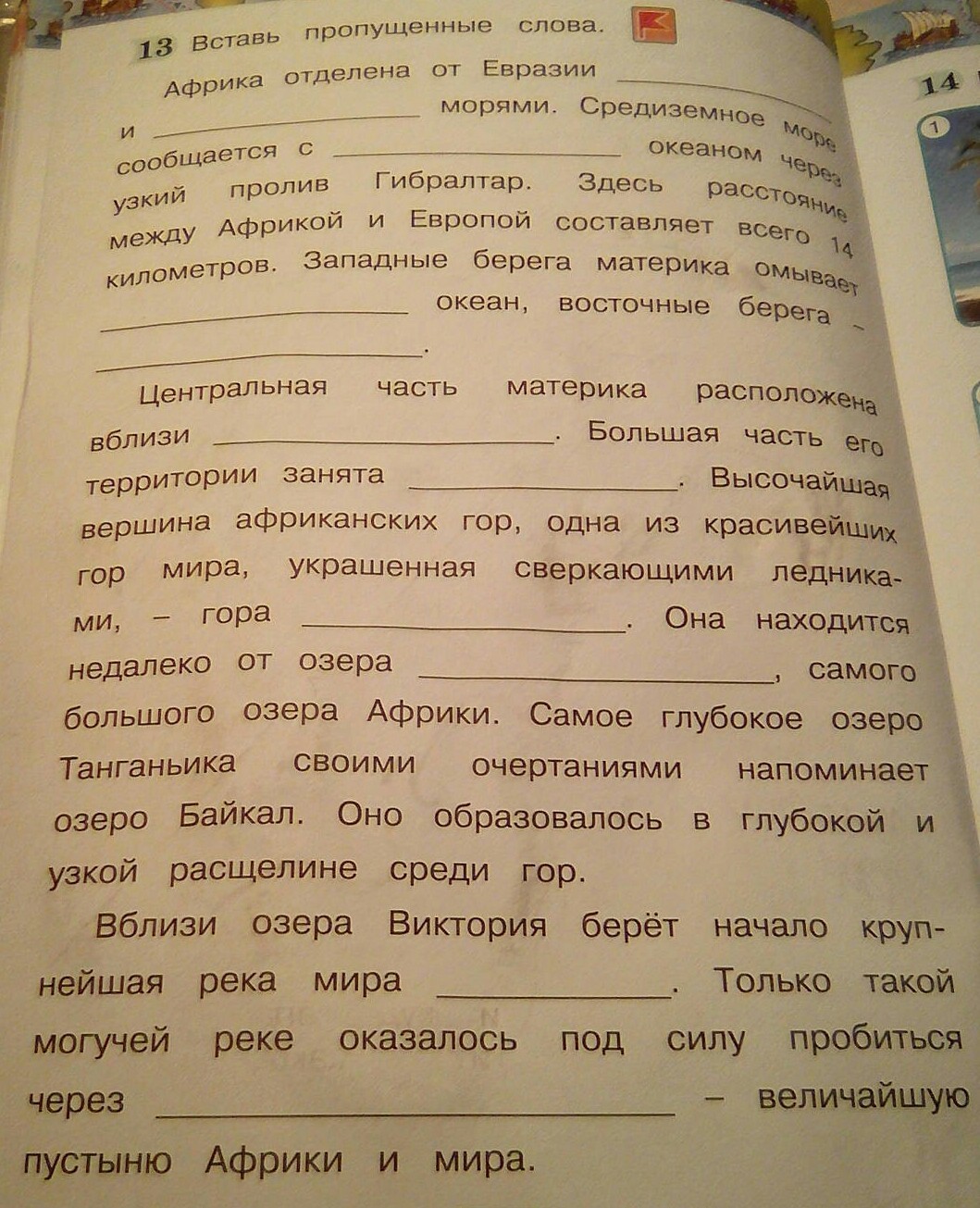 Африка отделена от Евразии Средиземным и Красным морями.Средиземное море сообщается с Атлантическим океаном через узкий пролив Гибралтар Здесь расстояние между Африкой и Европойсоставляет всего 14 км. Западные берега материка омывает Атлантический океан,восточные берега ИндийскийЦентральная часть материка расположена вблизи экватора. Большая часть его территории занята пустынями. Высочайшая вершина африканских гор , одна из самых красивейших гор мира, украшенная сверкающими ледниками гора Килиманджаро. Она находится недалеко от озера Виктория , самого большого озера Африки. Вблизи озера Виктория берёт начало крупнейшая река мира Нил. Только такой могучей реке оказалось под силу пробиться через Сахару -величайшую пустыню африки и мира .