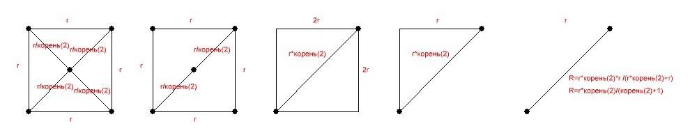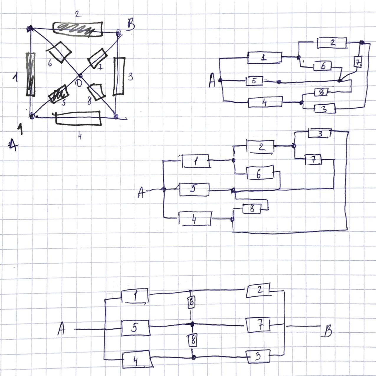 переход с первого на второй рисунок - убрал проводники соединяющие точки с одинаковым напряжением.