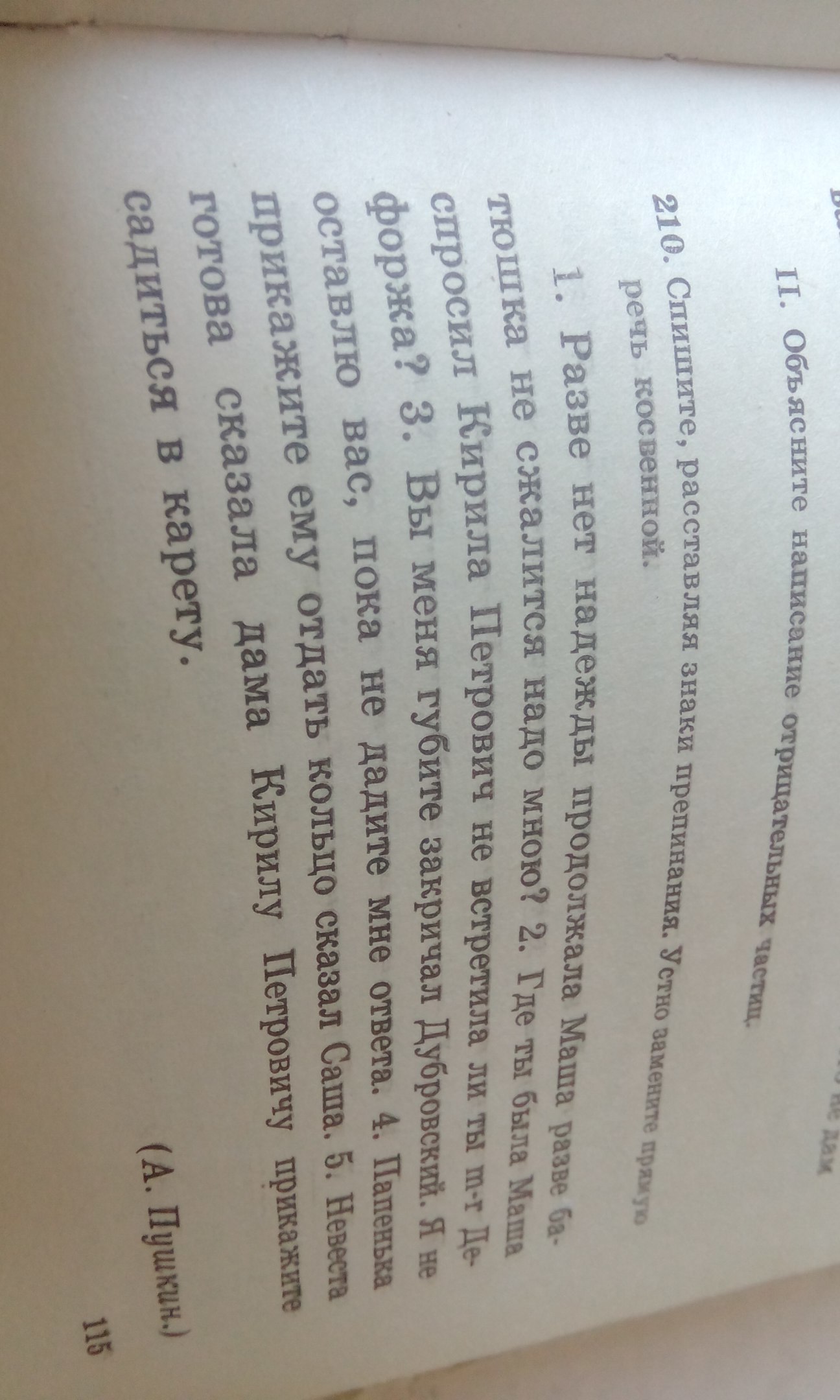 1."Разве нет надежды?"- продолжала Маша- "Разве батюшка не сжалится надо мною?" 2. "Где ты была, Маша?"- спросил Кирила Петрович- "Не встретила ли ты m-r Дефоржа?" 3. "Вы меня губите!"- закричал Дубровский.- "Я не отставлю вас, пока не дадите мне ответа". "Папенька, прикажите ему отдать кольцо"- сказал Саша. 5. "Невеста готова"- сказала дама Кирилу Петровичу- "Прикажете садиться в карету".