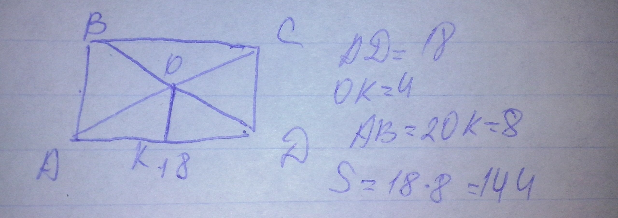 в прямоугольнике ABCD сторона AB равна 18 см. Расстояние от точки пересечения диогоналей до этой стороны ровно 4 см. найдите площать прямоугольника.