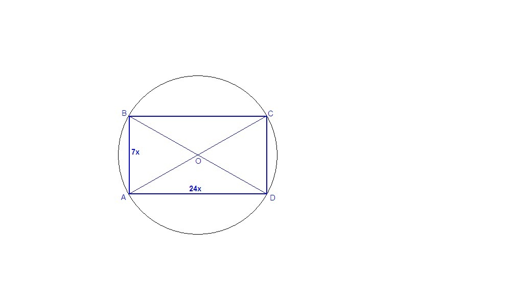 Вершины прямоугольника принадлежат окружности с радиусом 50 мм. Найдите стороны прямоугольника, учитывая, что они относятся как 7 : 24.