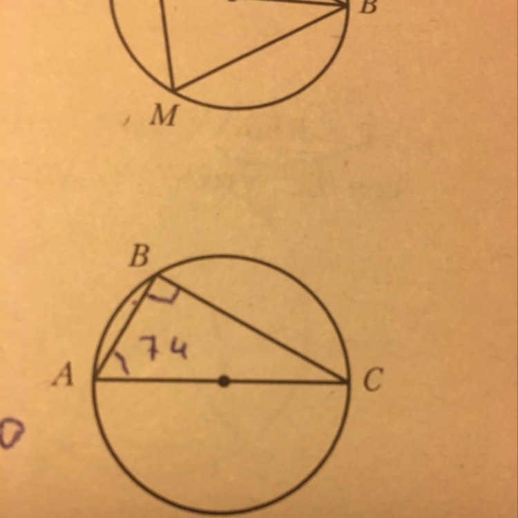 Так как одна сторона треугольник проходит через цент окружности и совпадает с диаметром, то этот треугольник будет прямоугольным. Угол В=90 градусов. А угол С= 180-(90+74)=180-164=16