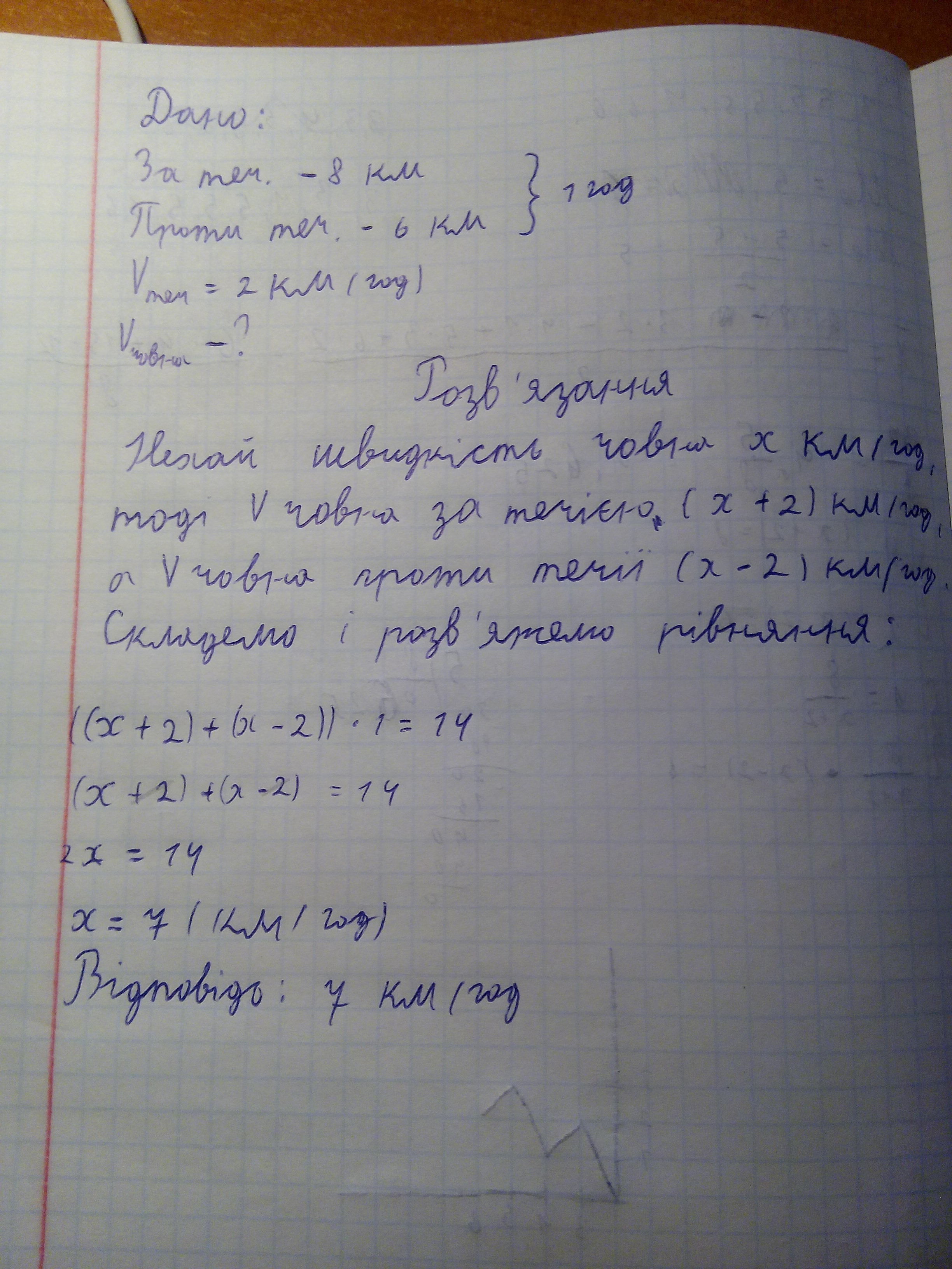 Моторний човен пройшов 6 км проти течії річки і 8км за течією , витративши на весь шлях 1 год. Яка швидкість човна в стоячій воді, якщо швидкість течії річки становить 2км/год.