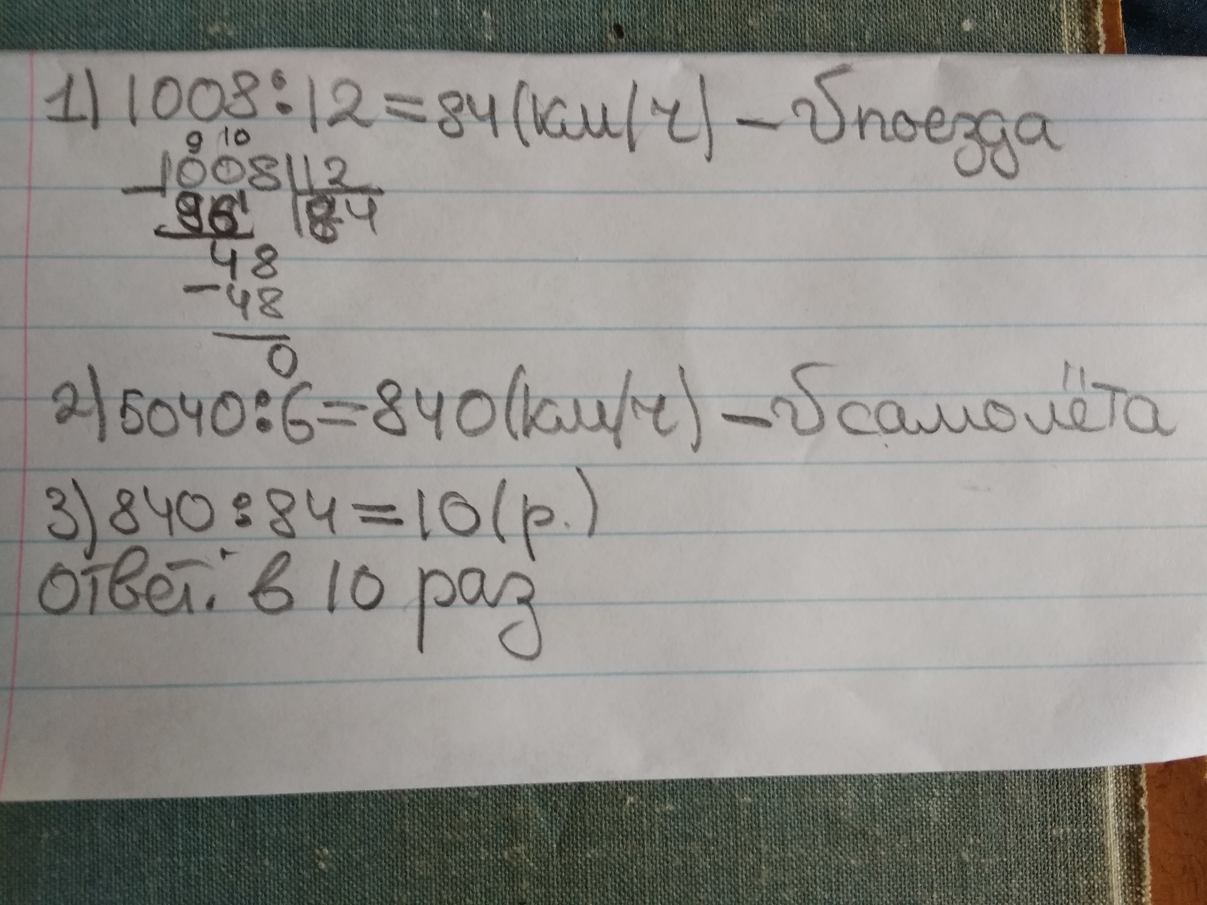 За 12 часов поезд прошёл 1008 км, а самолёт за 6 часов пролетел 5040 км. Во сколько раз скорость поезда меньше скорости самолёта?