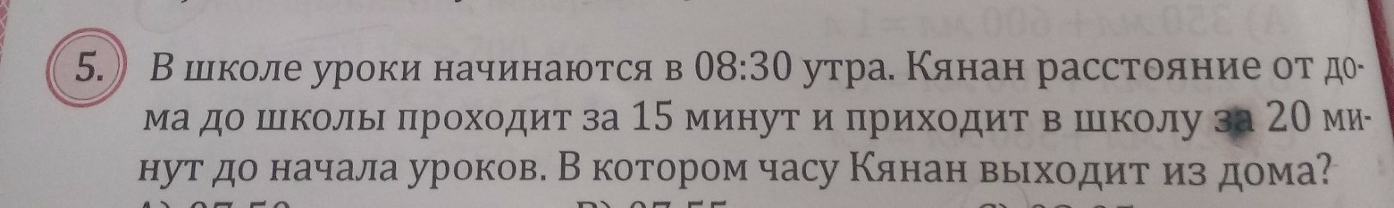 Если Канян приходит за 20 минут до начала урока, то 8ч 30мин - 20 мин = 8ч 10 мин - к этому времени приходит Канян. Вычтем отсюда ещё время пути от дома до школы: