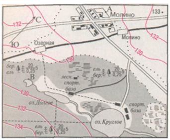 Чтобы попасть из точки В на берегу лесного озера к избушке лесника (на карте обозначено-«лесн»), надо идти по азимуту: