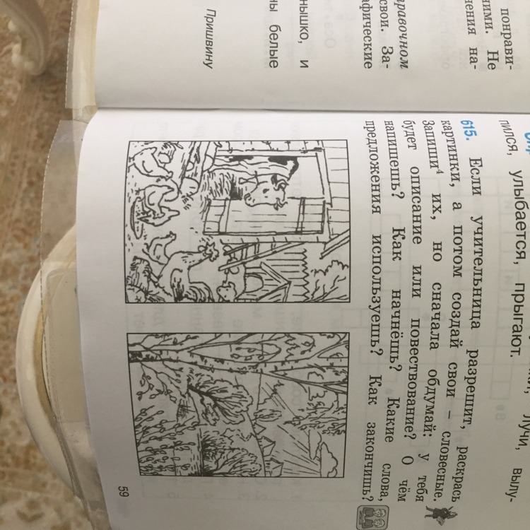 На первой картине изображены домашние животные : курицы , петухи , коровы и собака. Куры клюют еду а собака наблюдает за всеми животными .