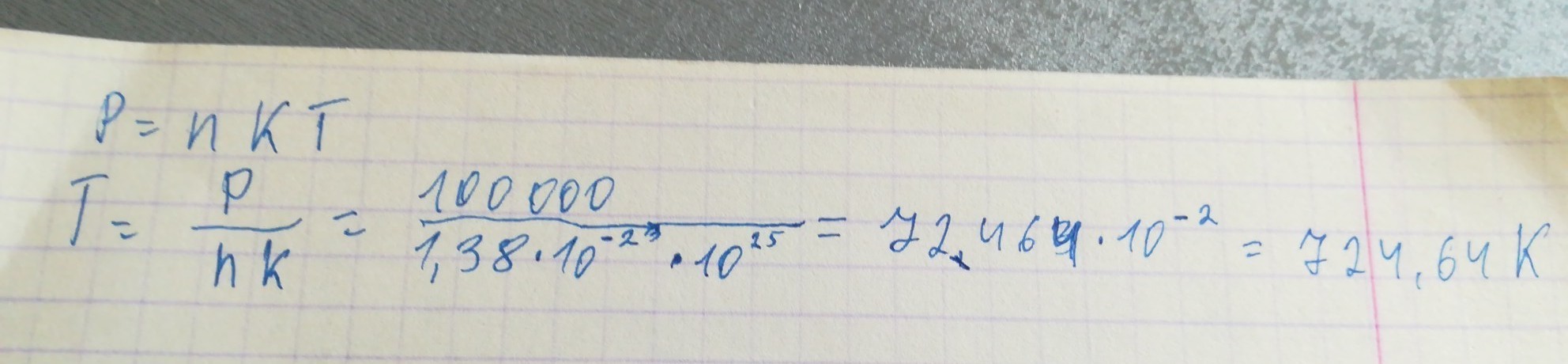 T=P/k*n=100*10^3/1,38*10^-23*10^25=724,6K