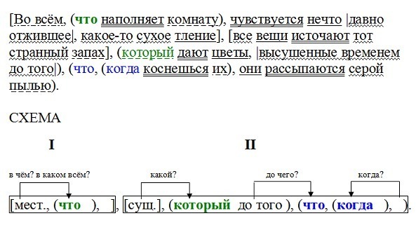 составьте схему предложения:во всем,что наполняет комнату,чувствуется нечто давно отжившее,какое-то сухое тление,все вещи источают тот странный запах,который дают тебе цветы,высушенные временем до того,что,когда коснешься их,они рассыпаются серой пылью.С какой связью это предложение.
