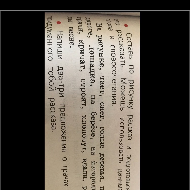 На рисунке художник изобразил денек ранней весны. Снег тает, и тут и там видна земля. По дороге едет повозка с лошадкой. Из дальних краев вернулись черные грачи. Они сидят на изгороди, на березе, летают в небе, строят свои гнезда. Птицы громко кричат, они рады весне и теплому солнышку.