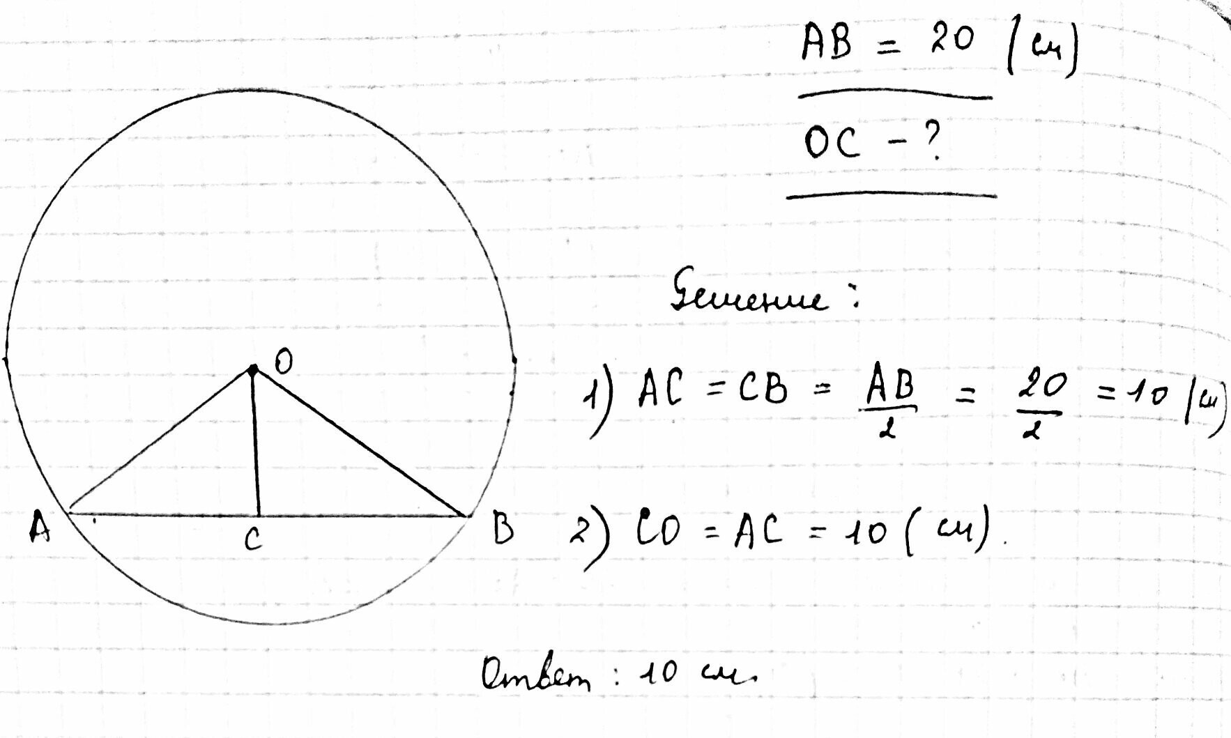 из центра окружности О к хорде АВ, равной 20 см , проведём перпендикуляр ОС.Найдите перепендикуляр к стороне АВ