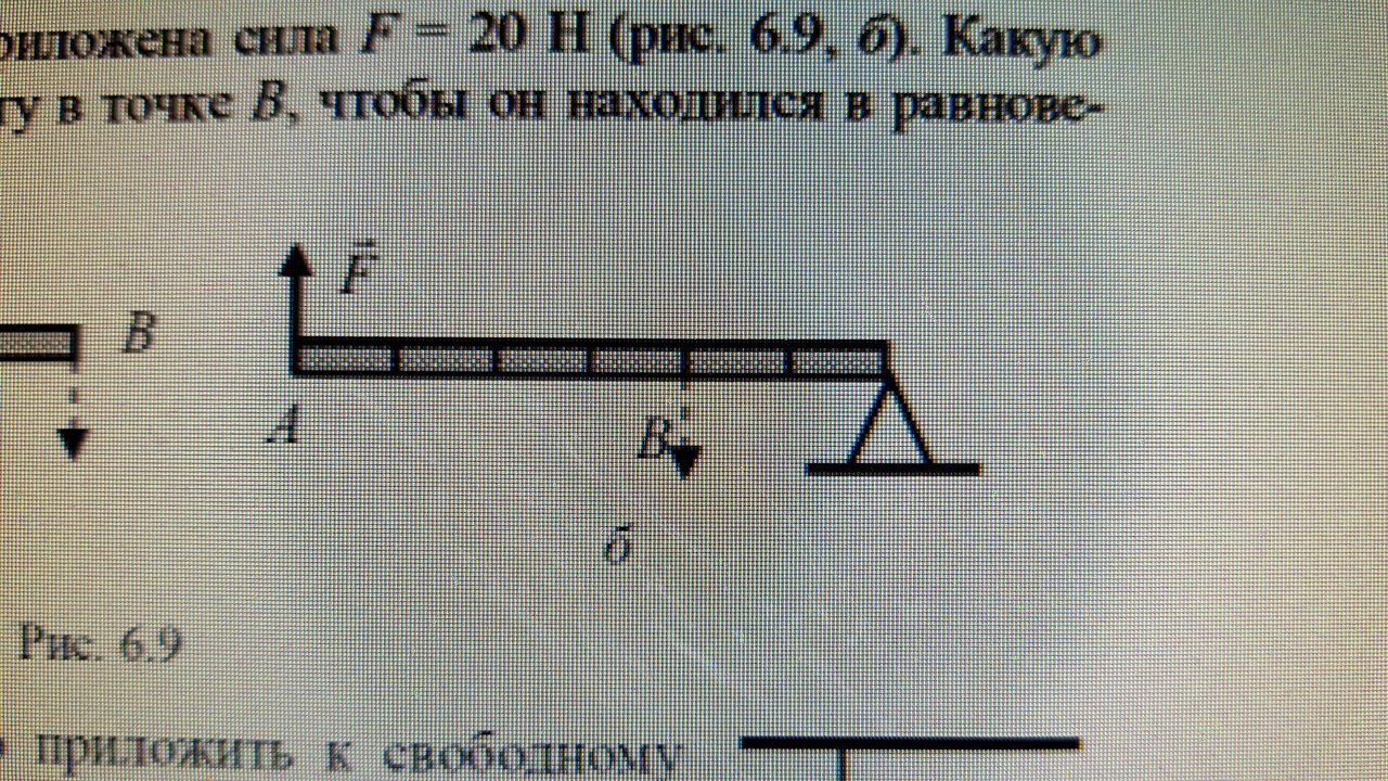 К точке А рычага приложена сила F=20 Н (рис.6.9,б). Какую силу надо приложить к рычагу в точке В, чтобы он находился в равновесии?