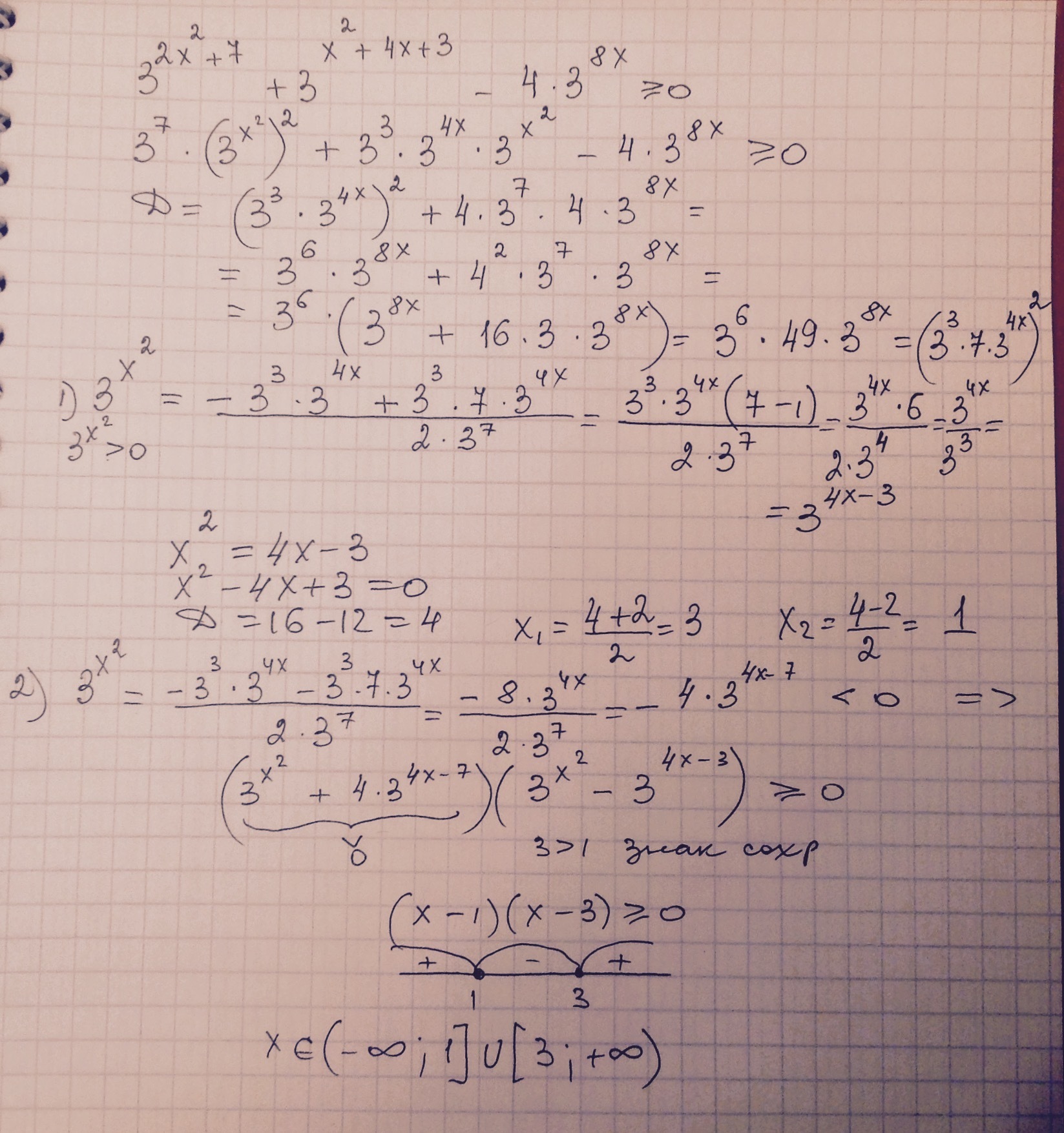 3^(2x^2+7)+3^(x^2+4x+3) - 4*3^(8x) >=0