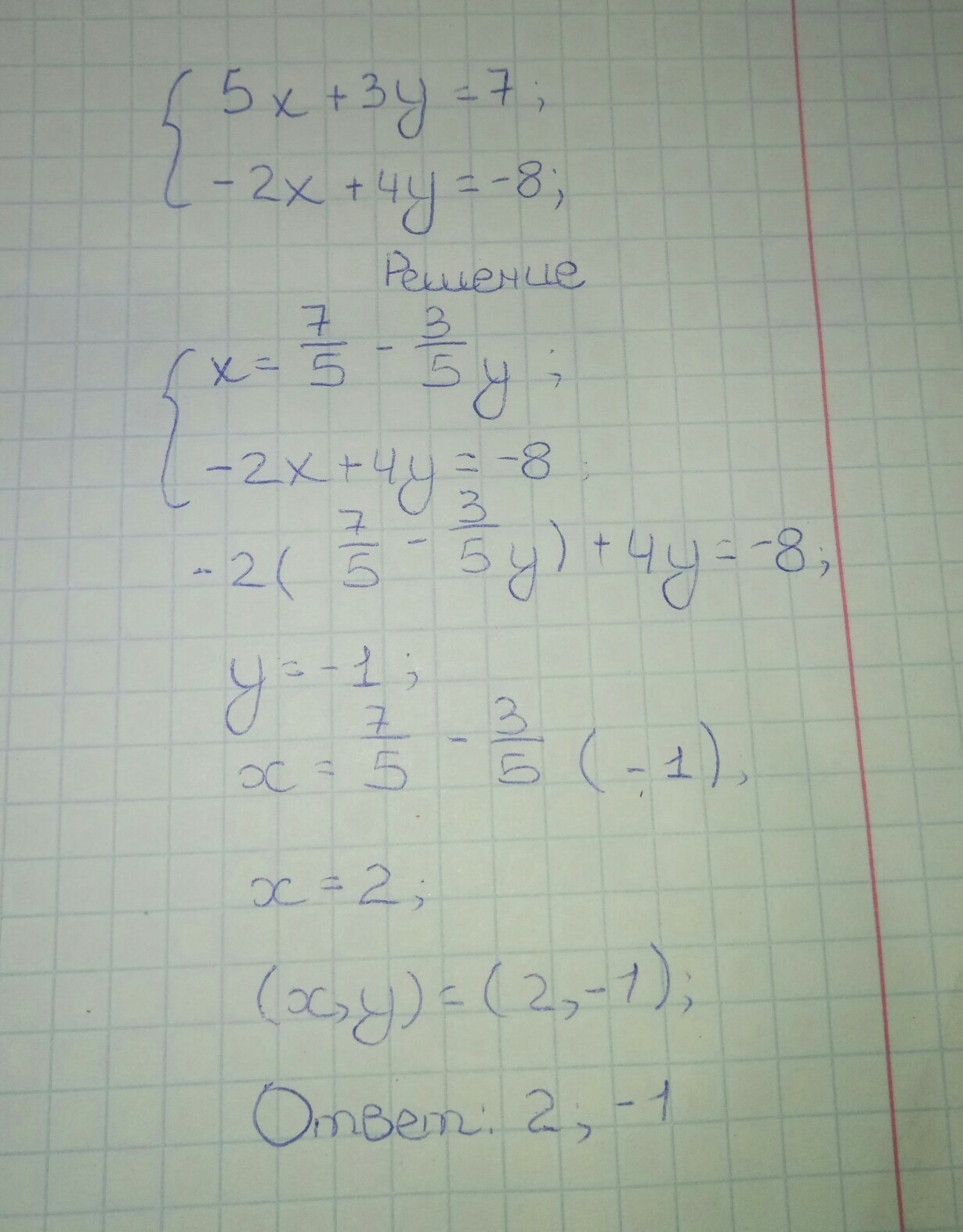 5x+3y=7/*2⇒10x+6y=14