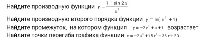 y`=((1+sin(2x))/x²)`=(2*cos(2x)*x²-(1+sin(2x))*2x)/(x²)²=