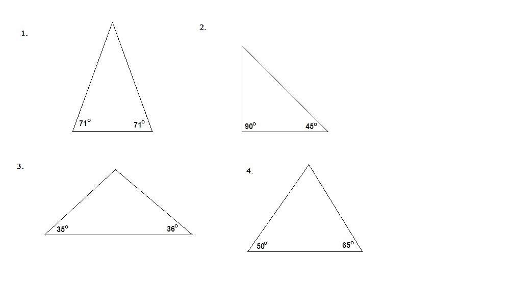 используя данные, приведенные на рисунке укажите номера рисунков на которых изображены равнобедренные треугольники:71градусов и 71градусов ,90градусов и 45 градусов ,35 градусов и 36градусов ,50 градусов и65 градусов