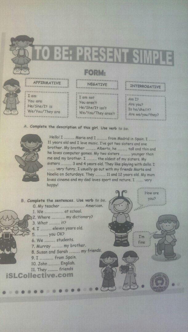 A. hello! I am Maria and I am from Madrid in Spain. I am 11 years old and I love music. I’ve got two sisters and one brother. my brother is Alberto, he’s tall and thin and he loves computer games. my two sisters are younger than me and my brother. I am the oldest of my sisters. my sisters are three and four years old. they like playing with dolls. I am very funny. i usually go out with my friends Marta and Noelia on Saturdays. they are 11 and 12 years old. my mom loves cinema and my dad loves sport and nature. I am very happy.