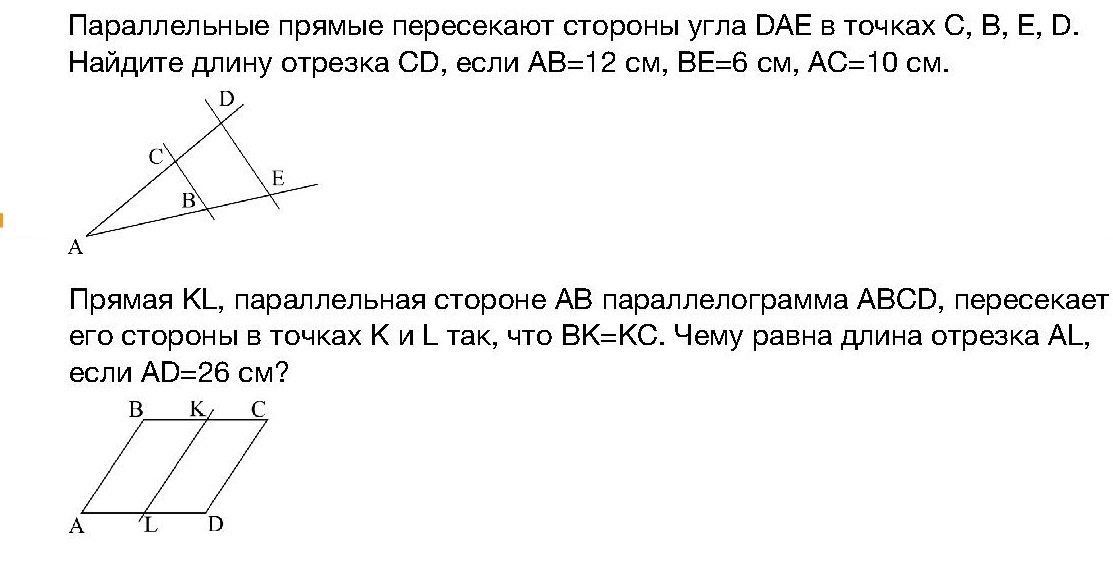 Прямая KL идет параллельно сторонам параллелограмма. Если она проходит через середину одной стороны, то и другую пересечет в середине. AD=26; AL=13см.