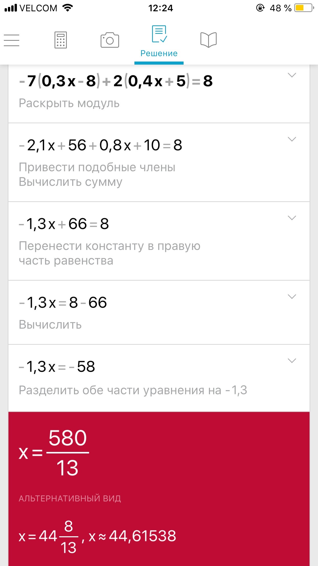 2. Найдите корень уравнения: А) -7(0,3х-8)+2(0,4х+5)=8