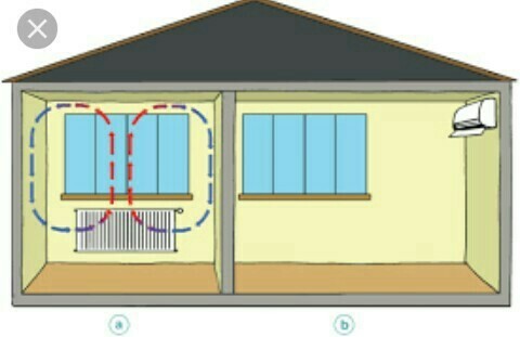 Представлена схема двух способов отопления комнат (а,b):левая комната отапливается батареей под окном (а),правая же кондиционером.Объясните причину теплового движения воздуха в комнате.