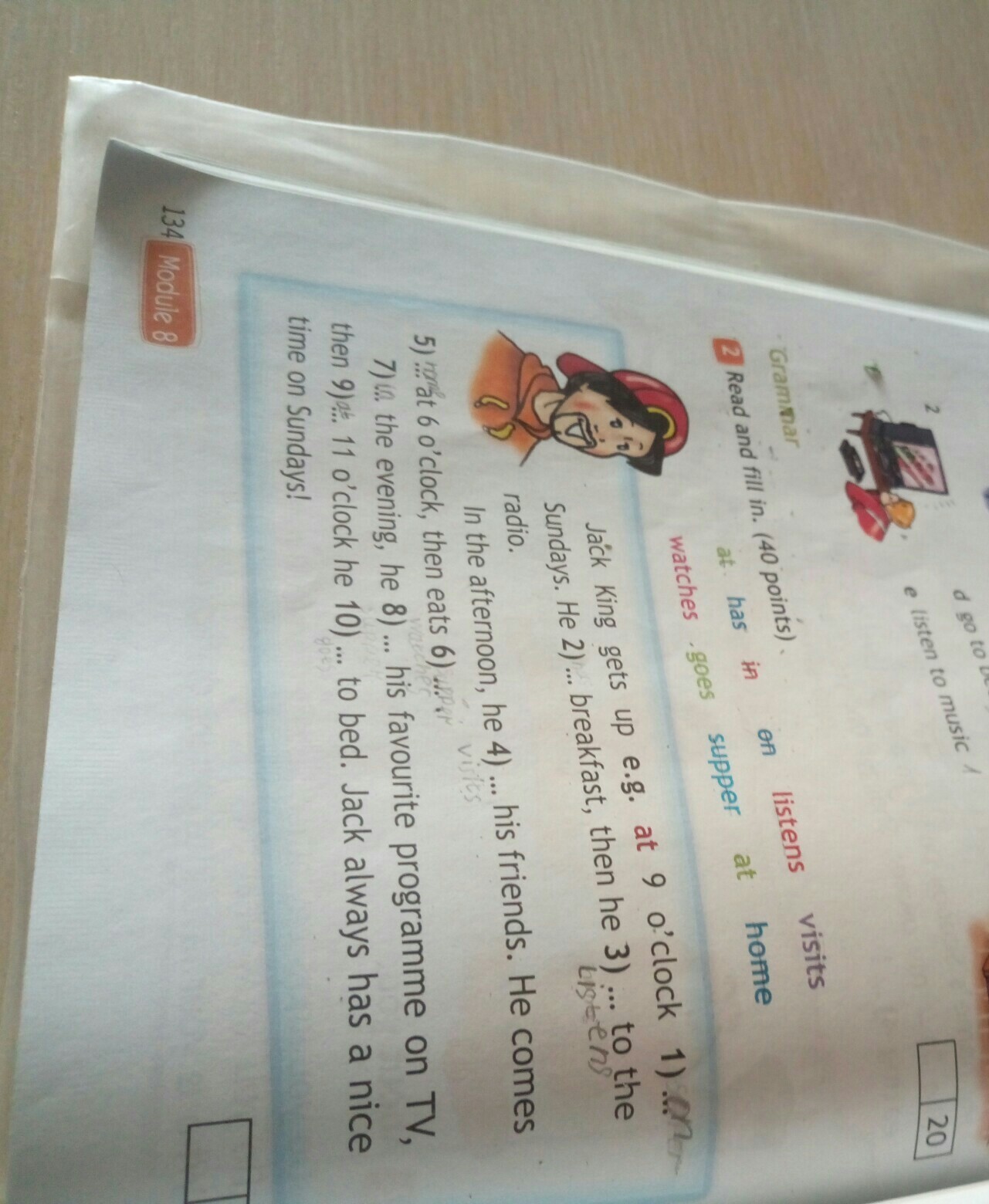 Король Джек встаёт в 9 часов по понедельникам. Он (has) завтракает а затем слушает радио. Днём он посещает своих друзей. Он приходит в 5 часов и затем обедает. Вечером он смотрит свою любимую передачу по телевизору а потом в 11 часов идёт в кровать(спать). Джек всегда хорошо проводит время по понедельникам