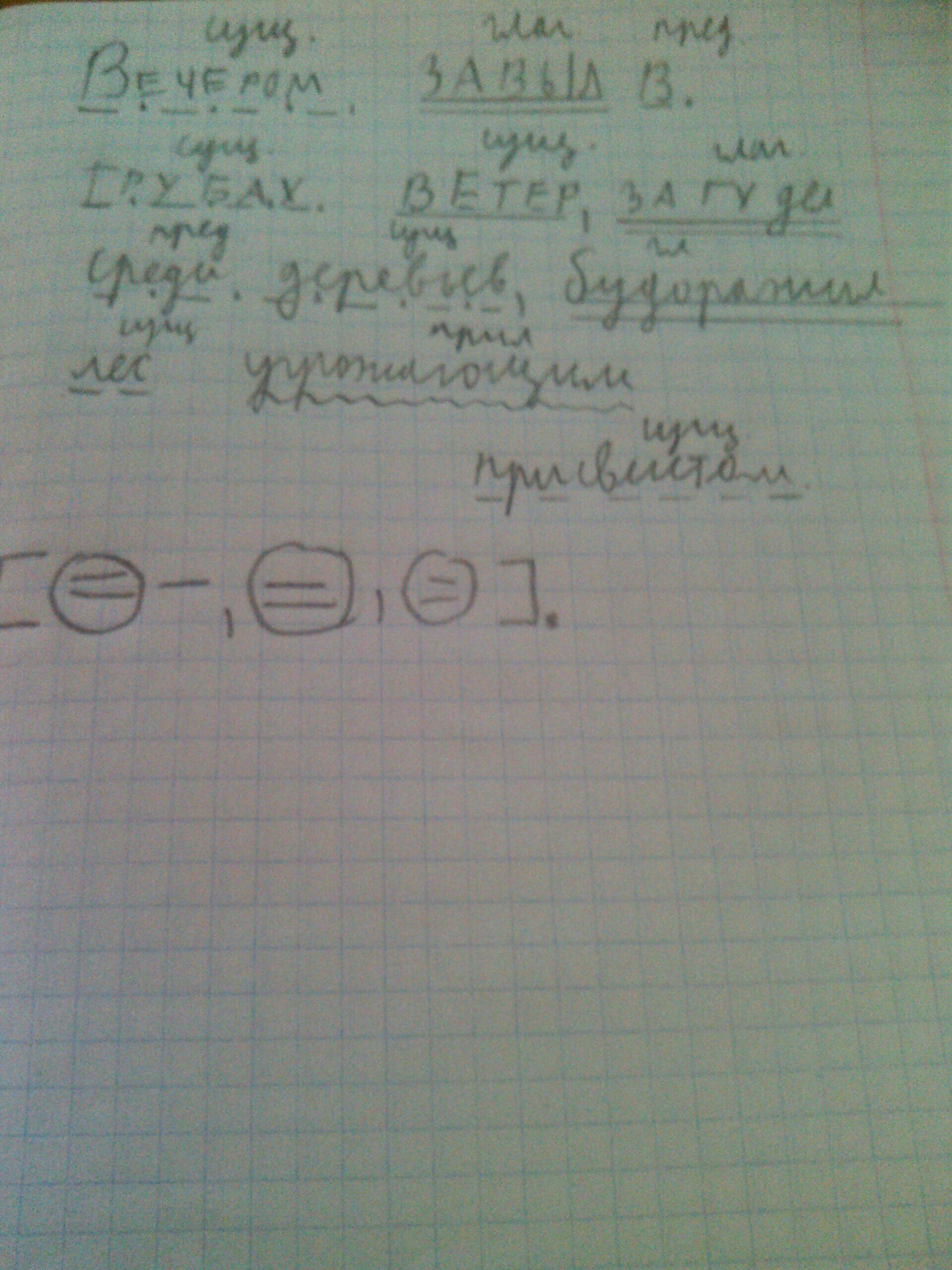 Вечером(обстоятельство, сущ.) завыл(сказуемое,гл.) в трубах(обстоятельство,сущ.) ветер(подлежащее, сущ.), загудел(сказуемое, гл.)среди деревьев(обстоятельство, сущ.), будоражил(сказуемое,гл.) лес(доп.,сущ.) угрожающим(прил.) свистом(доп.,сущ.).(Повествовательное, невосклицательное, простое, двусоставное, распространённое, осложнено однород. членами предложения)