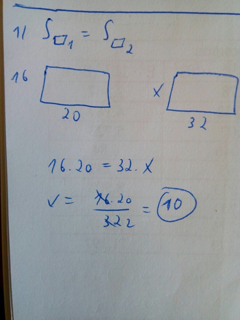 Имеются два прямоугольника одинаковой площади Ширина первого 16 см длина 20 см а длина второго 32 см Какова ширина второго прямоугольника