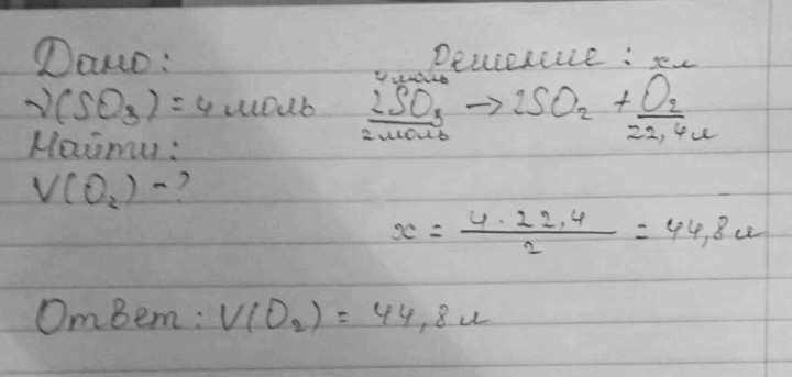 Рассчитайте объём кислорода при нормальных условиях, если в реакции разложения использовалось 4моль SO3.