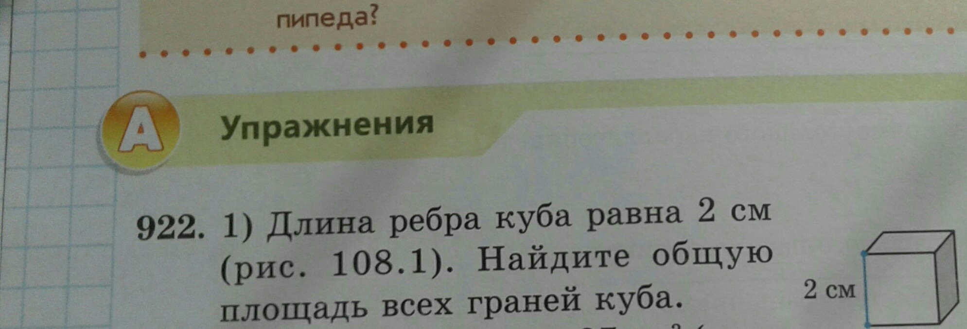 длина ребра куба равна 2 см (рис.108.1.)Найдите общую площадь всех граней куба.