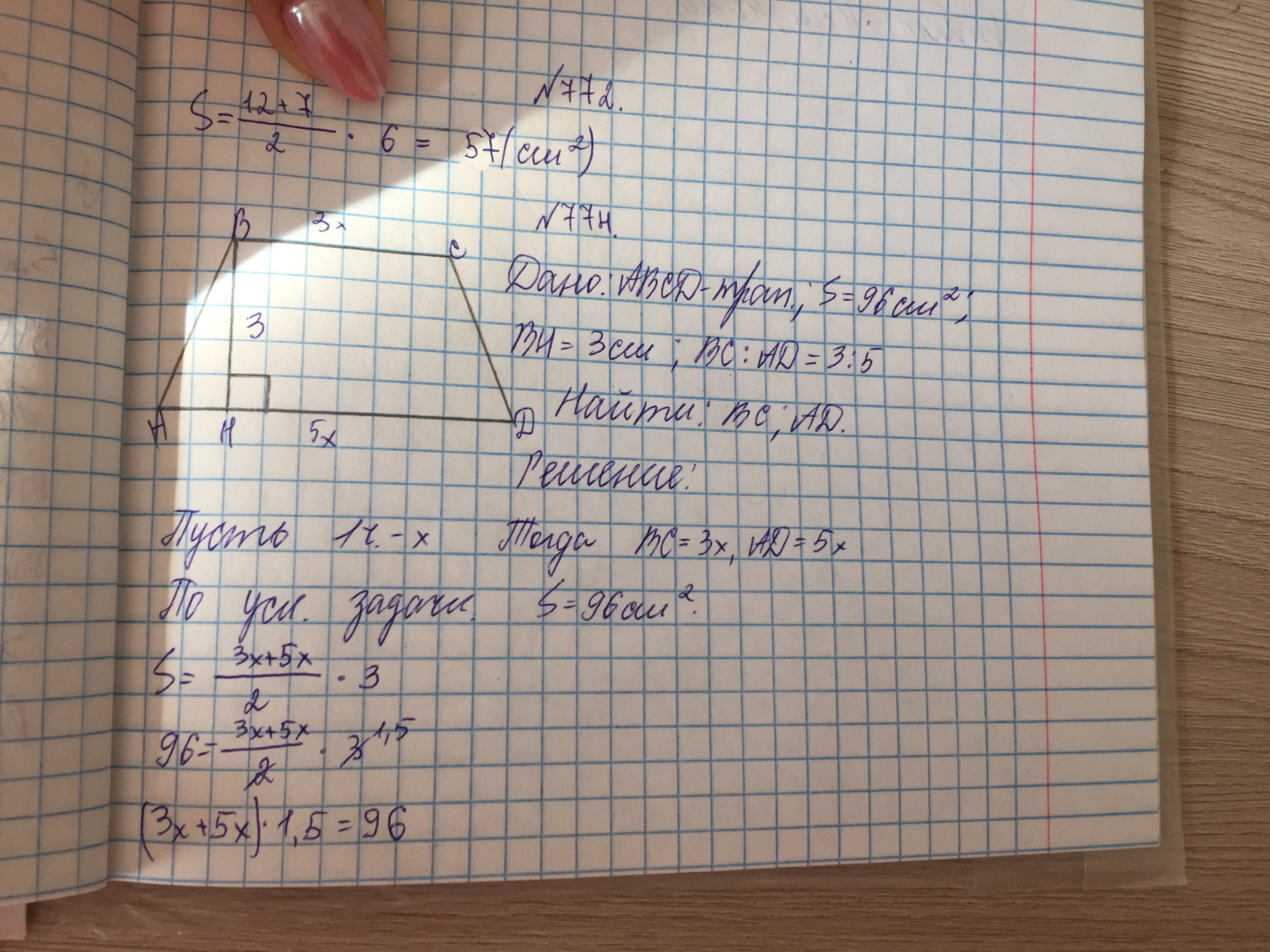 Площадь трапеции равна 96 сантиметров в квадрате а ее высота 3 сантиметра найдите основания трапеции если они относятся как 3 к 5
