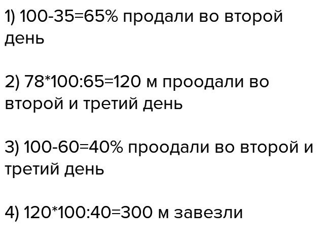 В первый день было продано 60 процентов завезённой в магазин ткани, во второй -- 35 процентов оставшегося количества, а в третий -- остальные 78 м. Сколько м ткани завезли в магазин?