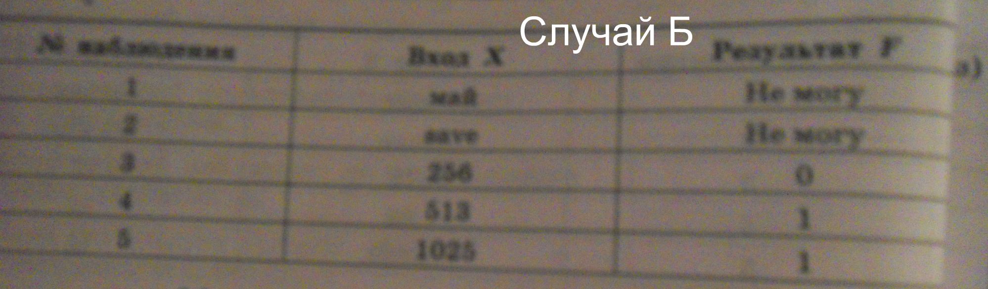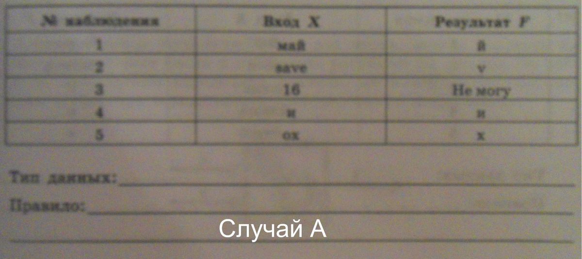 Автоматическое устройство имеет один вход,можно подавать на него натуральные числа или последовательности символов и наблюдать результат на выходе.По таблице наблюдений определите тип входных данных и правило,по которому осуществляется их преобразование. Помогите пожалуйста)Только 2 случая осталось