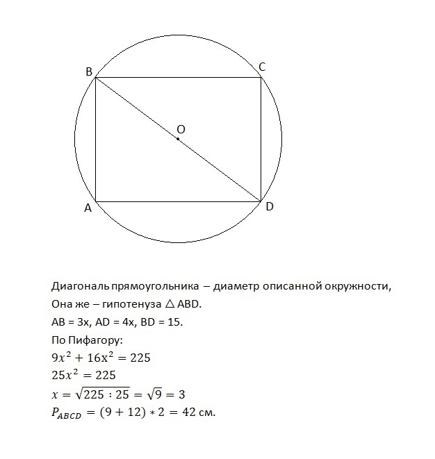 Найдите периметр прямоугольника вписанного в окружность если радиус 7,5 см а стороны прямоугольника относятся как 3:4.
