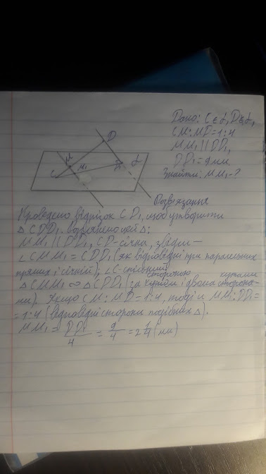 Точка С належить площині альфа, а точка Д їй не належить, точка М ділить відрізок СД у відношені СМ:МД=1:4, через точки М:Д проведено паралельні прямі, які перетинають площину альфа у точках С1 Д1. Знайдіть довжину відрізка ММ1 якщо ДД1 =9мм.