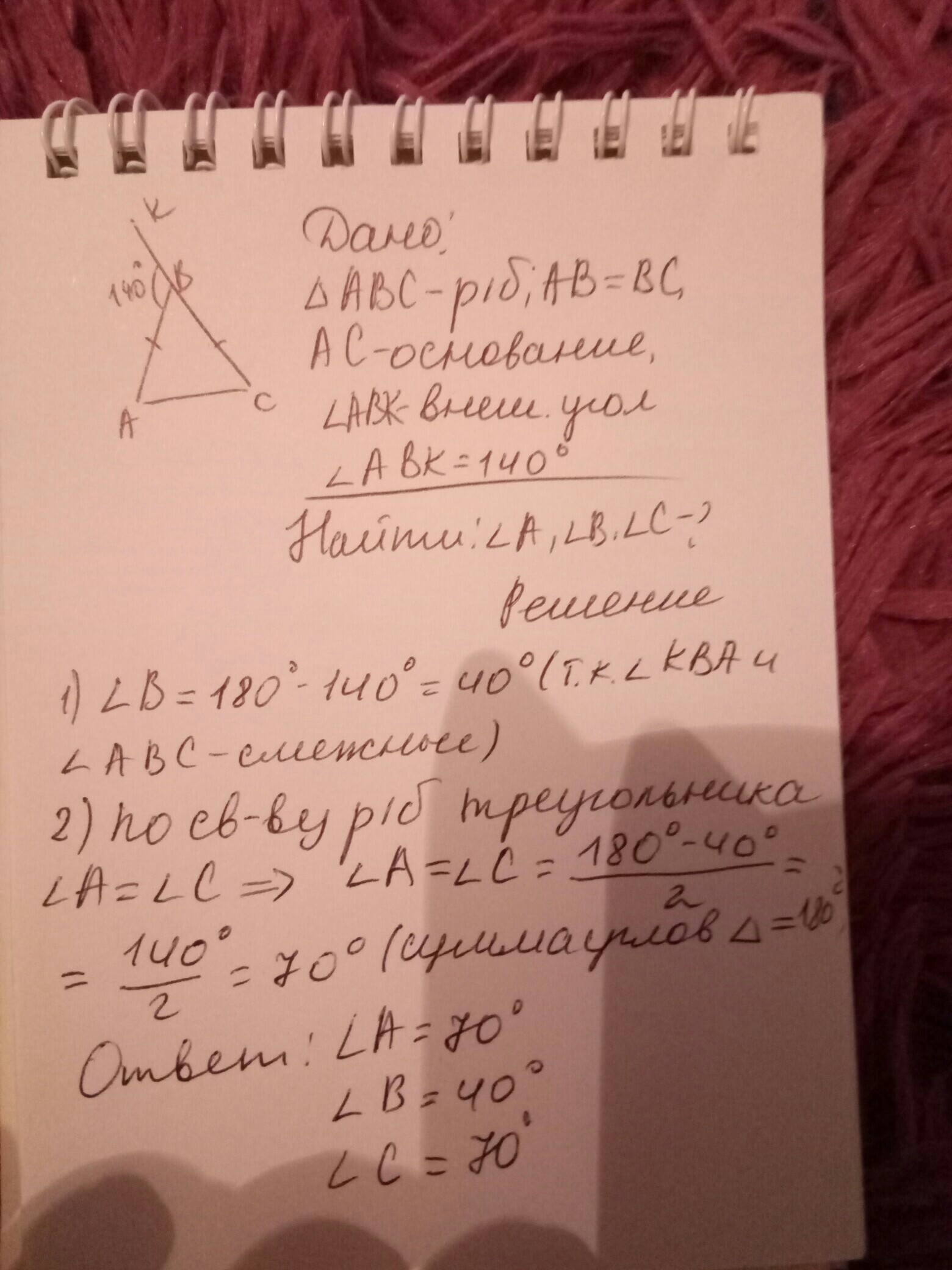 дан равнобедренный треугольник АВС основание АС внешний угол В=140 градусам найти угол А угол В угол С