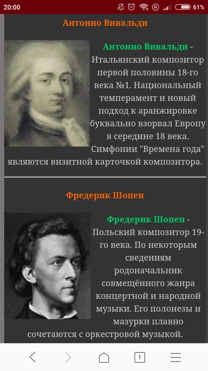 Бах,Гайдн,Шопен,Шуберт,Штраус, Рахманинов, Прокофьев, Чайковский, Мусоргский, Григ, Бизе