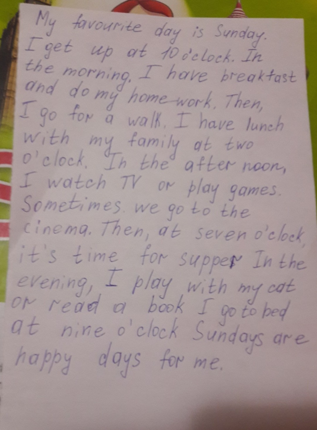 Мой любимый день - это воскресенье. Я просыпаюсь в 10 часов. Утром я завтракаю и делаю уроки. Затем, я иду гулять. Я обедаю со своей семьей в 2 часа. В обед я смотрю телевизор или играю в игры. Иногда мы ходим в кино. Затем 7 часов это время супер(чего? Вот это странное предложение). Вечером я играю с моей кошкой или читаю книгу. Я иду ложиться спать в 9 часов. Воскресенье - счастливый день для меня.