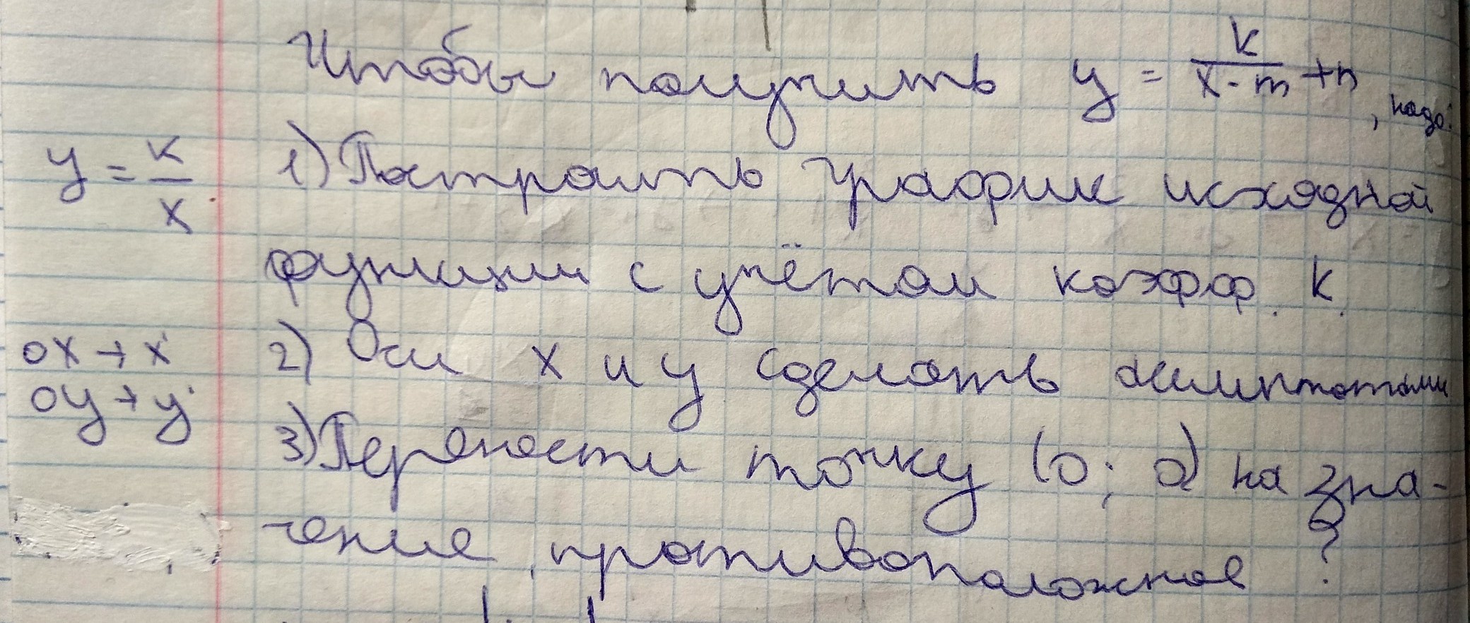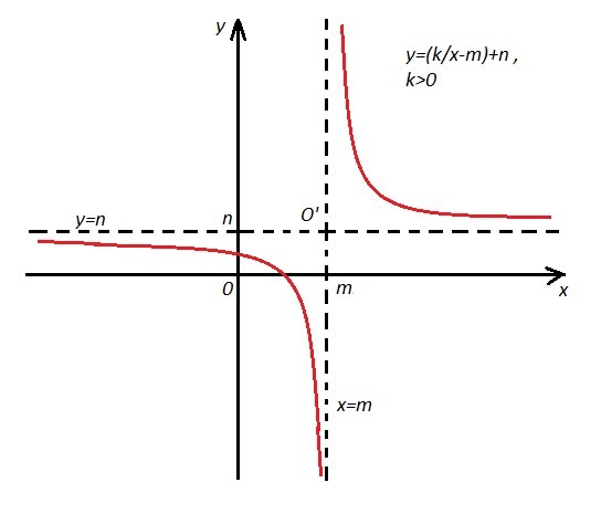 2) перенести эту гиперболу вдоль оси ОХ на m единиц вправо, если в знаменателе стоит разность (x-m) , и влево, если в знаменателе записана сумма (x+m) ; 3) затем перенести полученный график на n единиц вдоль оси ОУ вверх, если имеем (+n), и вниз, если имеем (-n) .