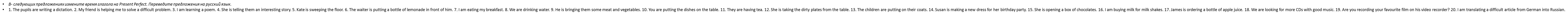 The pupils have a dictation. 2. My friend is helping me to solve a difficult problem. 3. I am learning a poem. 4. She is telling them an interesting story. 5. Kate is sweeping the floor. 6. The waiter is putting a bottle of lemonade in front of him. 7. I am eating my breakfast. 8. We are drinking water. 9. He is bringing them some meat and vegetables. 10. You are putting the dishes on the table. 11. They are having tea. 12. She is taking the dirty plates from the table. 13. The children are putting on their coats. 14. Susan is making a new dress for her birthday party. 15. She is opening a box of chocolates. 16. I am buying milk for milk shakes. 17. James is ordering a bottle of apple juice. 18. We are looking for more CDs with good music. 19. Are you recording your favourite film on his video recorder? 20. I am translating a difficult article from German into Russian.