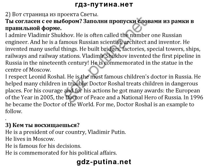 Я восхищаюсь Владимиром Шуховым. Его часто называют русским инженером номер один. И он - известный русский ученый архитектор и изобретатель. Он изобрел много полезных вещей. Он строил мосты, фабрики, специальные башни, суда, железные дороги и железнодорожные станции. Владимир Шухов изобрел первый трубопровод в России в девятнадцатом веке! Он отмечается в статуе в центре Москвы. Я уважаю Леонида Рошала. Он самый известный детский врач в России. Он помогал многим детям в беспокойстве. Доктор Рошаль относился к детям в опасных кружевах. За свою храбрость и за свои действия он получил множество наград: «Европейский год 2005 года», «Доктор мира» и «Национальный герой России». В 1996 году он стал Доктором Мира. Для меня примером для доктора является доктор Рошаль.