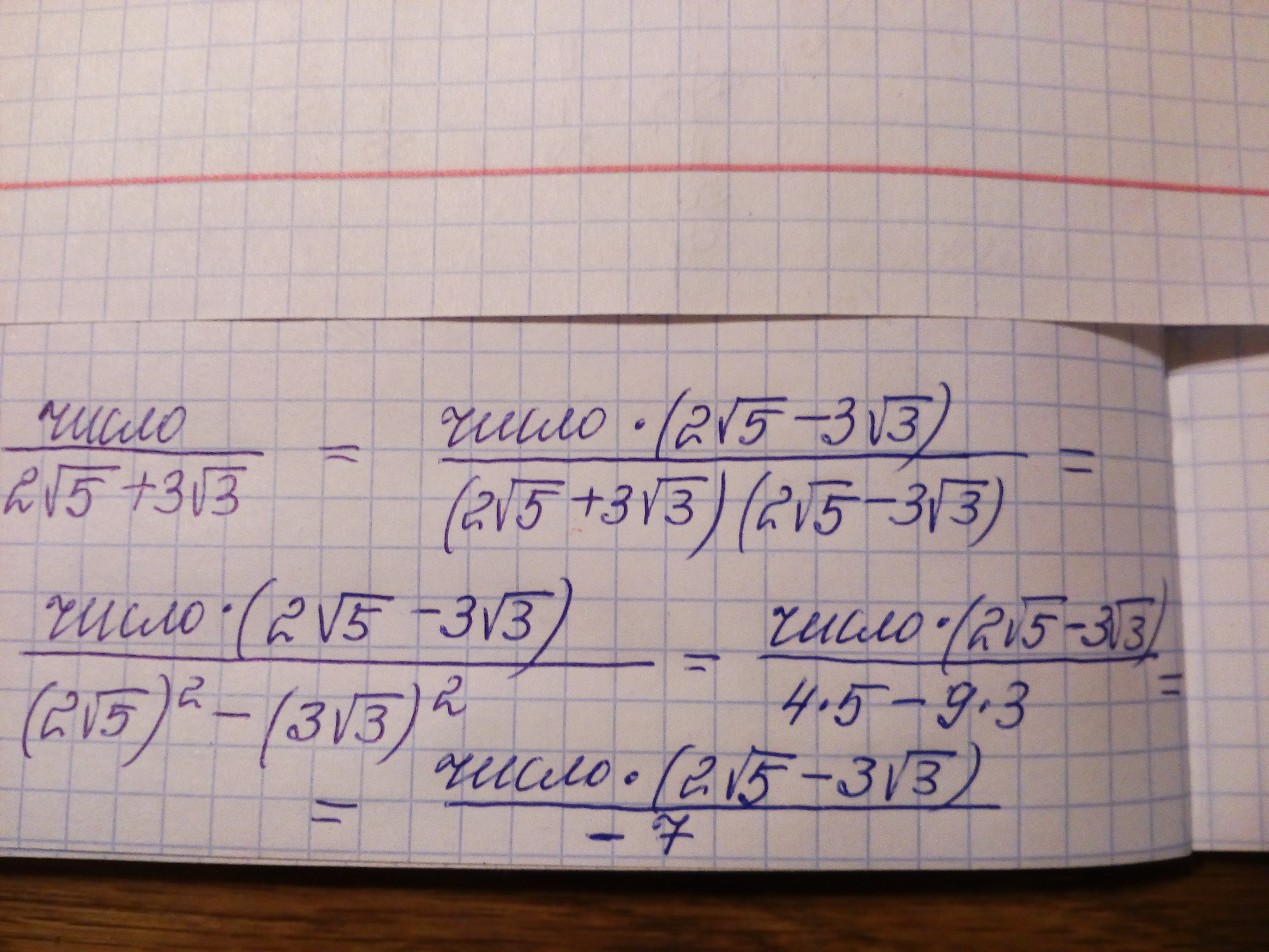 Как избавиться от корня в знаменателе если предположим знаменатель = 2 корня из 5 + 3 корня из 3